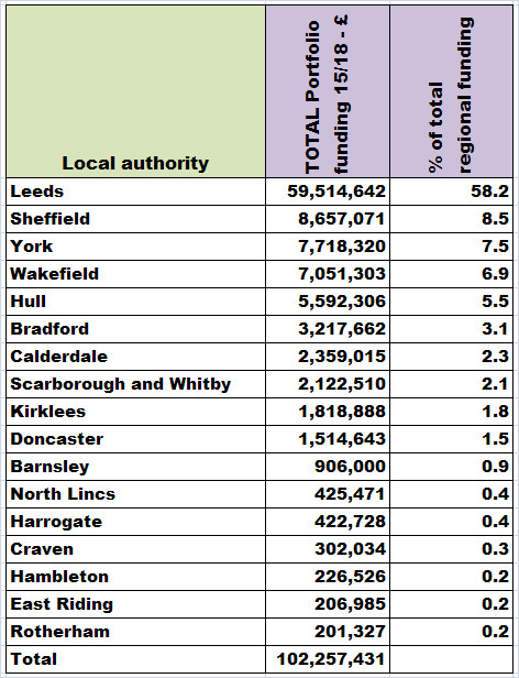 And here’s a little table showing how much of the total cash for the Yorkshire region (48.7%) is snaffled by the top four big Leeds arts organisations.